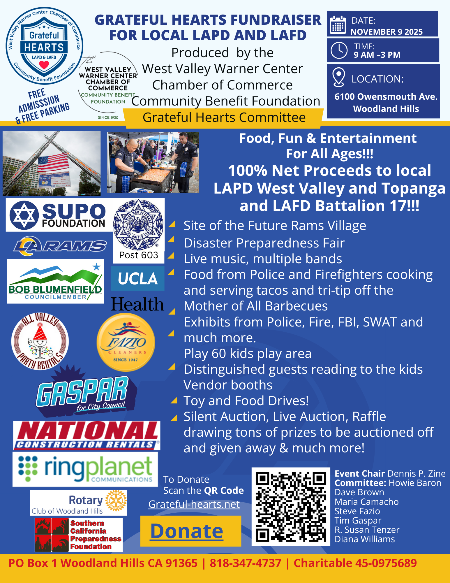 Grateful Hearts will be held in the heart of Future site of Rams Village on Sunday November 9 from 9 AM- 3 PM. Offering the extended community, you, your families, your colleagues and employees to participate in the supporting our local Heroes! -LAFD Battalion 17 and LAPD Topanga and West Valley Stations-