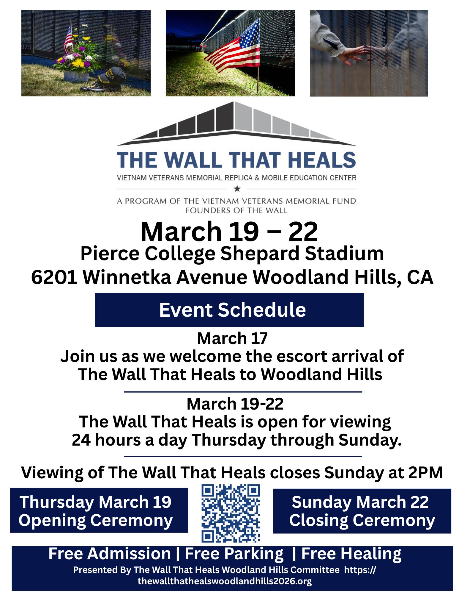 Veterans, families, and community members are invited to experience The Wall That Heals in Woodland Hills at Pierce College, March 19–22. This traveling memorial offers a powerful space for remembrance, connection, and healing, featuring a replica of the Vietnam Veterans Memorial and a Mobile Education Center that shares the impact of the Vietnam War. The exhibit is free to attend and welcomes veterans of all eras, their families, and those wishing to pay tribute.